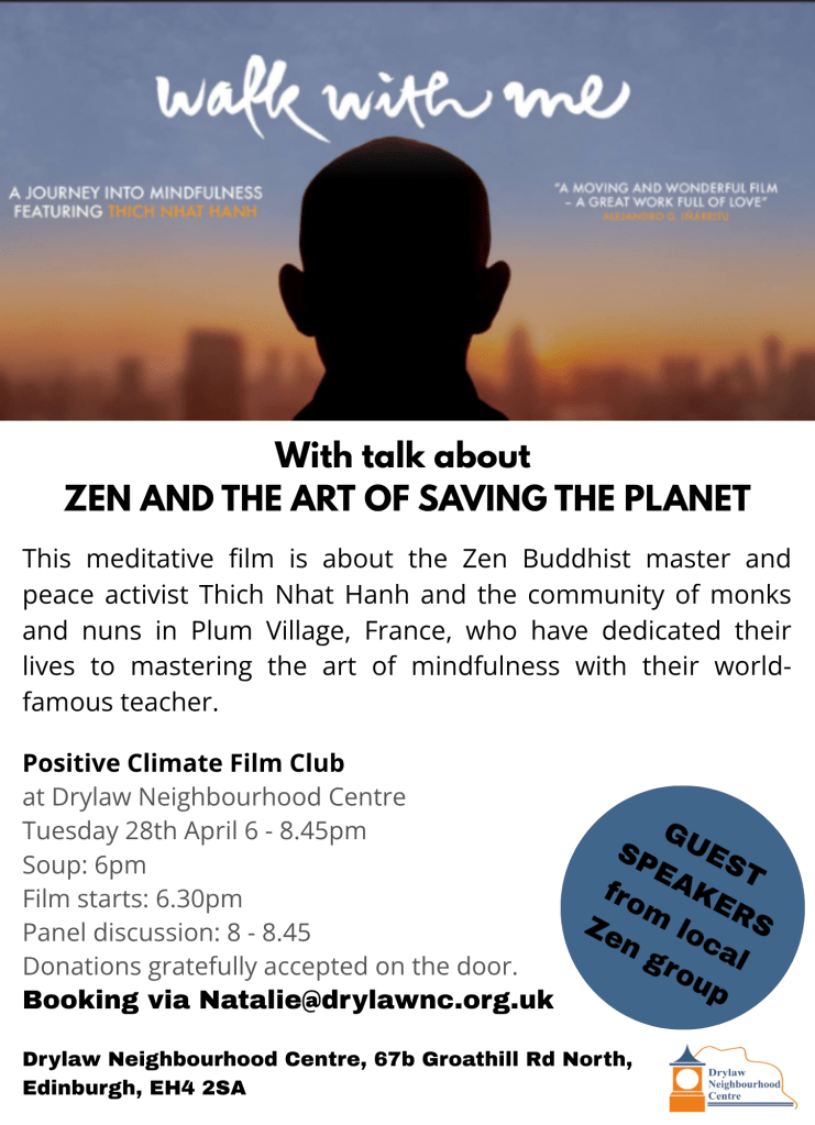 This is just to make it clear that the Day of Mindfulness with the Plum Village Monastics on 11 April that has been organised by Edinburgh Wake Up is open to everyone to come to. It’s not just for Wake Up age people. Details are all on the flyer attached.