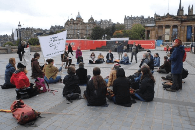 - Also coming up is our next Silent Rebellion on Saturday 20th November at the usual time of 12.30-2pm, facilitated on this occasion by Gustav and Ainsley. Because our normal venue next to the National Gallery has been occupied by the not-so-mindful consumerism of Underbelly’s Christmas Market, we’ll be moving to a new location, outside St Mary’s Cathedral near John Lewis.