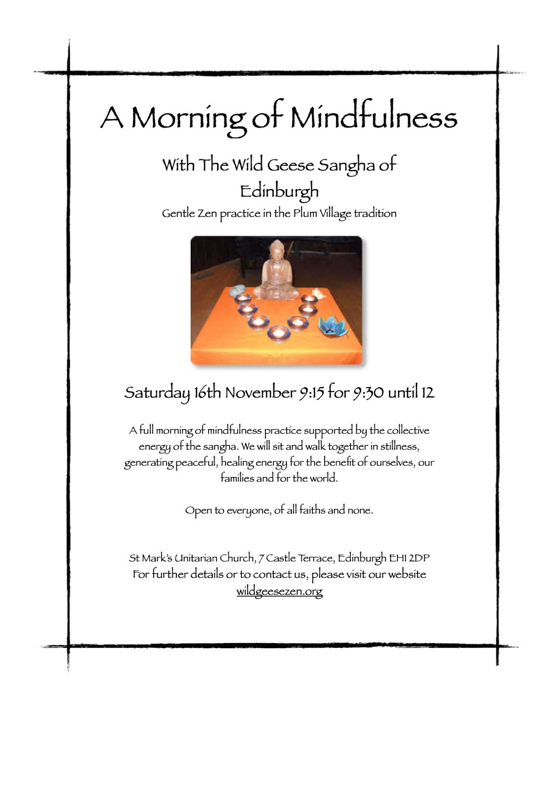 A full morning of mindfulness practice supported by the collective energy of the sangha. We will sit and walk together in stillness, generate peaceful, healing energy for the benefit of ourselves, our families and for the world.