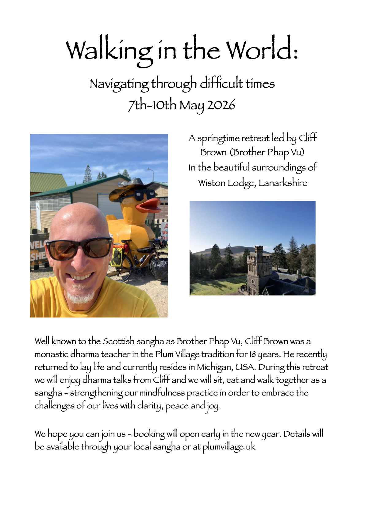 A springtime retreat led by Cliff Brown (Brother Phap Vu) In the beautiful surroundings of Wiston Lodge, Lanarkshire.